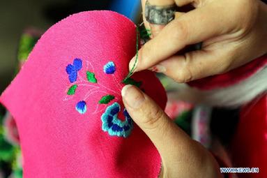 A woman of Qiang ethnic group does embroidery at a workstation in Yinxing Township of Wenchuan County in the Tibetan and Qiang Autonomous Prefecture of Aba, southwest China's Sichuan Province, March 1, 2012. The Qiang ethnic minority, with a history of more than 3,000 years, is one of the original ethnic groups in China. The traditional Qiang embroidery has been listed as one of the national intangible cultural heritages. However, the Qiang culture suffered from severe destruction after the devastating earthquake in 2008, which left a total of 87,000 people dead or missing and millions homeless. To revive the endangered Qiang embroidery became an important part of local government's post-disaster reconstruction program. With support of a women's organization in Aba, a training school was set up to teach local women the Qiang embroidery skills for free. Women also benefited from more than 30 workstations in many counties in Aba, which offered instruction to them on the embroidery business as well as production. All these efforts have helped the Qiang embroidery get effective salvation and protection. (Xinhua/Xue Yubin)