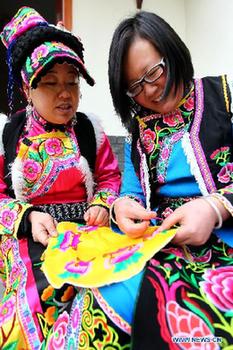 A teacher (L) of a women's training school introduces embroidery skills at a local woman's home in Yinxing Township of Wenchuan County in the Tibetan and Qiang Autonomous Prefecture of Aba, southwest China's Sichuan Province, March 1, 2012. The Qiang ethnic minority, with a history of more than 3,000 years, is one of the original ethnic groups in China. The traditional Qiang embroidery has been listed as one of the national intangible cultural heritages. However, the Qiang culture suffered from severe destruction after the devastating earthquake in 2008, which left a total of 87,000 people dead or missing and millions homeless. To revive the endangered Qiang embroidery became an important part of local government's post-disaster reconstruction program. With support of a women's organization in Aba, a training school was set up to teach local women the Qiang embroidery skills for free. Women also benefited from more than 30 workstations in many counties in Aba, which offered instruction to them on the embroidery business as well as production. All these efforts have helped the Qiang embroidery get effective salvation and protection. (Xinhua/Xue Yubin)