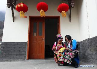 A teacher (L) of a women's training school introduces embroidery skills at a local woman's home in Yinxing Township of Wenchuan County in the Tibetan and Qiang Autonomous Prefecture of Aba, southwest China's Sichuan Province, March 1, 2012. The Qiang ethnic minority, with a history of more than 3,000 years, is one of the original ethnic groups in China. The traditional Qiang embroidery has been listed as one of the national intangible cultural heritages. However, the Qiang culture suffered from severe destruction after the devastating earthquake in 2008, which left a total of 87,000 people dead or missing and millions homeless. To revive the endangered Qiang embroidery became an important part of local government's post-disaster reconstruction program. With support of a women's organization in Aba, a training school was set up to teach local women the Qiang embroidery skills for free. Women also benefited from more than 30 workstations in many counties in Aba, which offered instruction to them on the embroidery business as well as production. All these efforts have helped the Qiang embroidery get effective salvation and protection. (Xinhua/Xue Yubin)