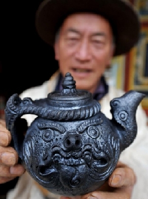 Tibetan artisan Sunro Chilin shows his artwork of black pottery at home in Tandu Village, Nyishar Township, Shangri-la County in Deqen Tibetan Autonomous Prefecture in southwest China's Yunnan Province on March 15, 2012.