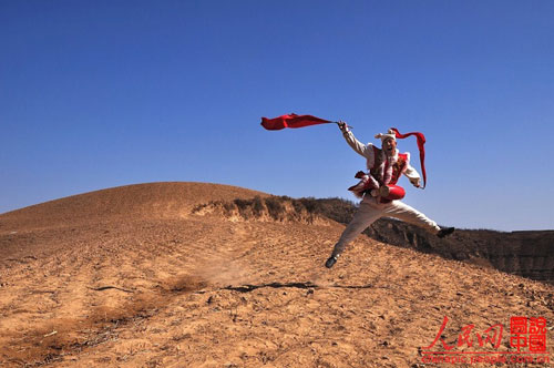 An actor performs waist drum dance on the Loess Plateau. (Chinapic.people.com.cn)