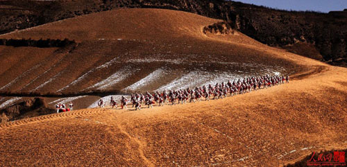 Actors perform waist drum dance on the Loess Plateau. (Chinapic.people.com.cn)