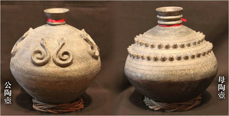 The first pottery to survive in appreciable quantities belongs to the Han Dynasty; most of it has been excavated from graves. Perhaps the commonest form is the hu (壺) , a baluster-shaped vase copied from bronze vessels of the same name and sometimes decorated with relief ornament in friezes taken directly from a bronze original. The hill jar (罐) is another fairly frequent form, and many models of servants, domestic animals, buildings, wellheads, dovecotes, and the like also have been discovered in graves.