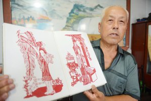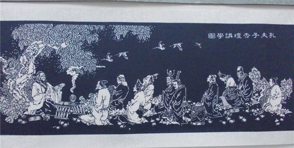 A paper-cut design of Confucius giving a lecture to his followers displayed at the 4th Chinese paper-cut art festival in Wei county, Hebei province. The festival was held July 8-10 and featured works from over 360 folk artists around China. [Photo by Tang Zhe/China Daily]