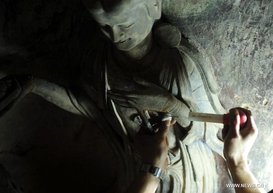 A worker repairs a sculpture at the Maiji Mountain Grottoes in Tianshui, northwest China's Gansu province, July 15, 2013. After protection and preparation, the Maiji Mountain Grottoes, the fourth largest grottoes in China and known as the "Oriental Sculpture Museum", has been ready for the application for status on the World Heritage List in 2014, as a part of the application program of the 2,000-year-old Silk Road which China works with Kazakstan and Kyrgyzstan and was officially submitted to the United Nations Educational, Scientific and Cultural Organization (UNESCO) in January of 2013. China has altogether 22 historical sites in this application program, including seven in Xinjiang, five in Gansu, six in Shaanxi and four in Henan. [Xinhua/Nie Jianjiang]