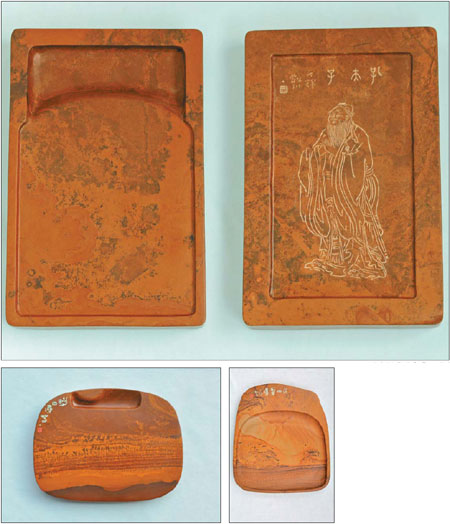 Clockwise from top: An inkstone inscribed with a portrait of the philosopher Confucius; The inkstone Nishan Hill is rare because of its natural pattern of mountain shapes and pine trees; The inkstone Looking for flowers in the spring gets its name from a poem by a Song Dynasty Confucian scholar, Zhu Xi. Photos Provided to China Daily