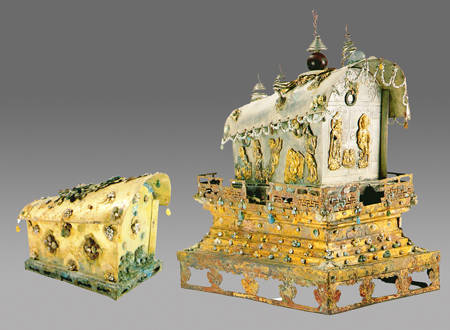 This gold coffin and a silver outer coffin date to the Tang Dynasty (618-907) and were discovered at the Qingshansi Site in northwest China’s Shaanxi province. The two pieces have a similar shape and a surface covered in decorative patterns adorned with pearls, jewels, crystal, and figures of Buddha’s disciples. This is an exquisite set of coffins with extraordinary craftsmanship.