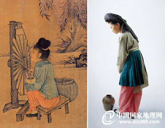Compared with the colors used by the upper class, civilians usually used much simpler colors like light green, blue or white. Ordinary women in the Song Dynasty usually wore narrow-sleeved blouses with pantskirts or vented pants. They also wore turbans called gai tou when they went out or worked in the fields. Most of the turbans were deep green. The blouses and skirts were usually green or white. As shown in the picture, their bellybands and pants were bright red so they stood out underneath their coats, which featured cooler colors.