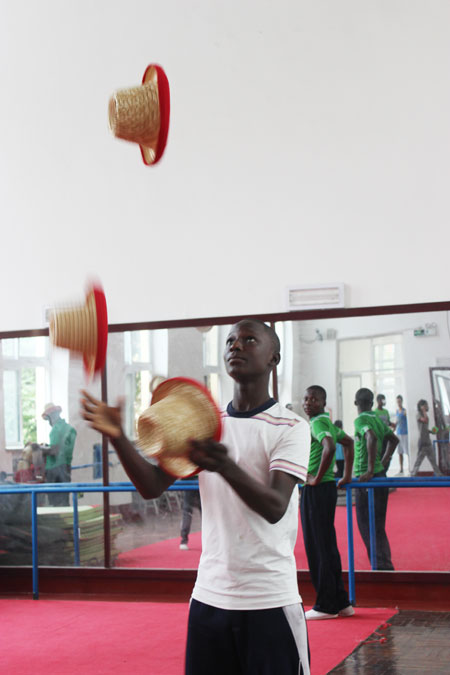 The male students from Nigeria have been training to group juggle straw hats, changing them rapidly between their heads. Beginners to acrobatics, they dropped the hats frequently to begin with, but they are making progress, according to Ma.
