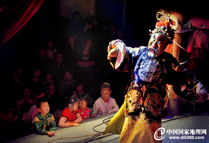 Children look carefully at the God of Wealth as he wears a smiling wooden mask while placing a big gold ingot on the table in the center of the stage. It is a traditional play performed before the real performance, which dates back to the Shang Dynasty (About 1600-1100 BC) and was part of a sacrificial ceremony. [Photo from Chinese Heritage]