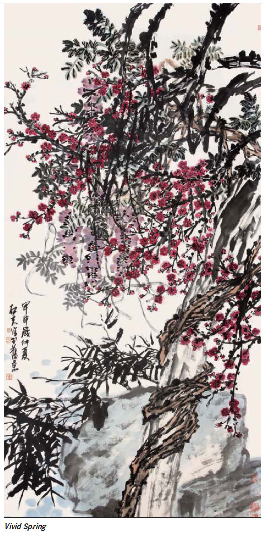 Instead of elaborate consideration and refinement of every detail, Guo prefers focusing on the general construction of a painting. The hefty lines endow the works with the spirit of calligraphy, vigorous and forceful.