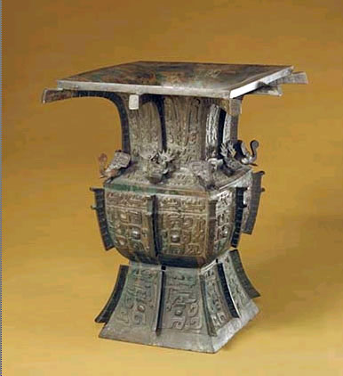 The bronze Xu Rectangular Vessel is a wine container popular from the Shang Dynasty (1556 BC – 1046 BC) to the Warring States period (475 BC -221 BC). It is 38 centimeters wide, 45.5 centimeters tall with a caliber measuring 33.6 * 33.4 centimeters. The vessel weighs 21.4 kilograms and has four handles on each side in the form of an elephant's head. Between the two handles are decorations of other unknown animals. The body is covered with motifs of dragons and animal masks against a thunder pattern.
