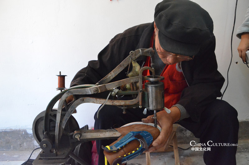An elderly man makes shoes with an antique machine. [photo by Yang Qi/chinaculture.org]