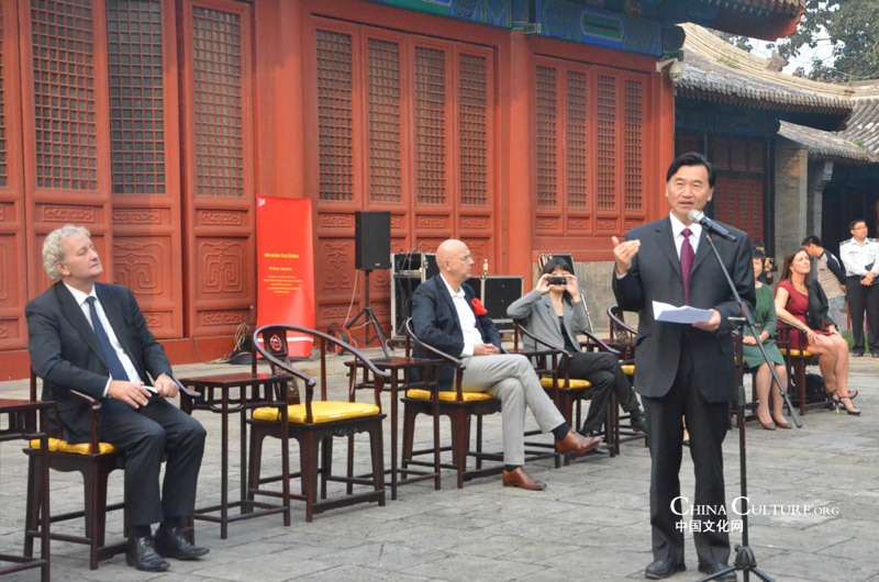Wu Zhiyou, curator of the Beijing Temple of Confucius & Imperial College Museum, gives a speech at the opening of the Peking Express exhibition on September 28, 2013 in Beijing. [photo by Yang Qi/chinaculture.org]