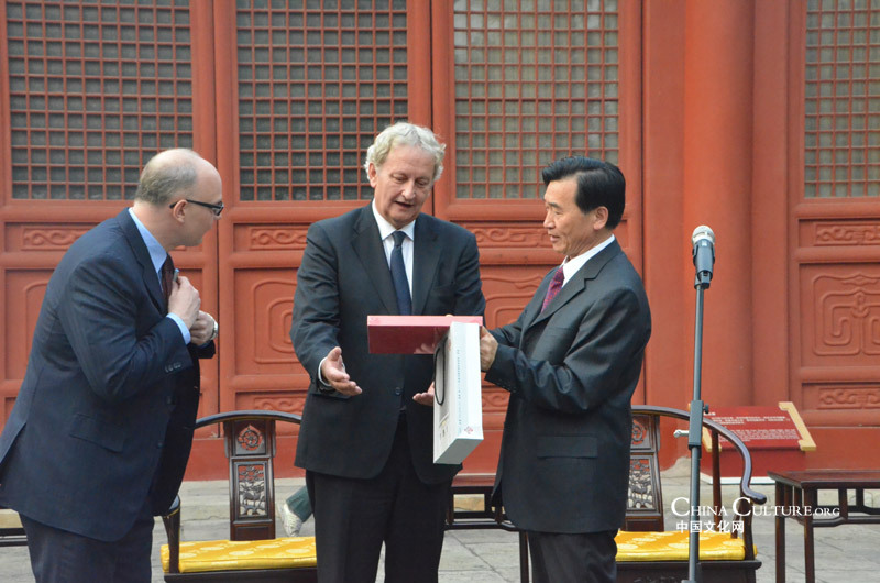 Wu Zhiyou presents a gift to Eberhard van der Laan, the mayor of Amsterdam at the opening of the Peking Express exhibition on September 28, 2013 in Beijing. [photo by Yang Qi/chinaculture.org]