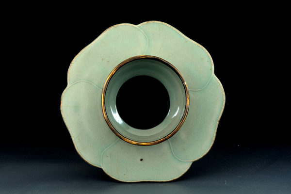 The cup holder is a hollow, bowl-shaped cylinder with a flat five-petal flange and a flared foot. The celadon glaze was well distributed with a few big cracks. The upper rim was inlaid with copper.