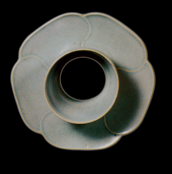 The front side of a Northern-Song flower-shaped cup holder from the Ru Kiln, on display in the British Museum.