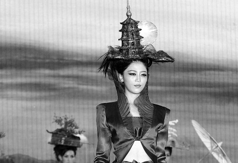 A model displays a pagodalike hair ornament in a creative hairstyle show in Hangzhou, Zhejiang province, on Sunday. The Leifeng Pagoda is a famous scenic site in the city.