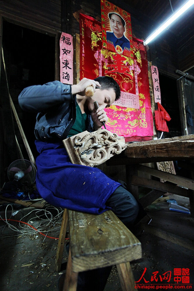 Other craftsmen work in the studio in Huangling. All the craftsmen work hard day and night, expecting to reproduce the most beautiful Hui style building and let the public see a glamour mountain village in its old time. (Photo/Chinapic.people.com.cn)
