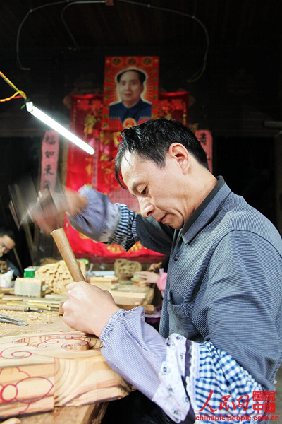 Jiang uses tools to carve the designed patterns on wood. (Photo/Chinapic.people.com.cn)