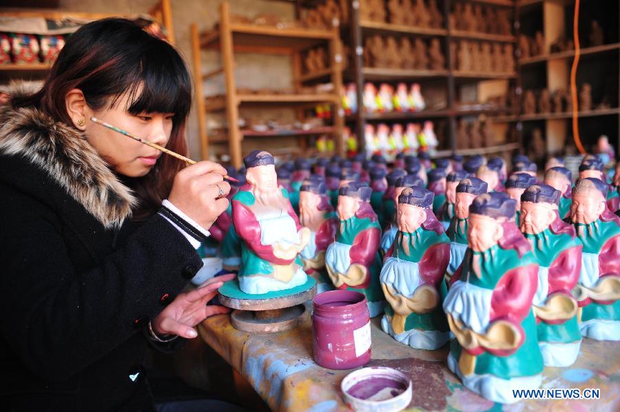 A apprentice of the clay sculptor Song Changfeng colors sculptures at Song's studio in Botou, North China's Hebei province, Oct 24, 2013. Song is the fourth generation of making the Sanchizhai clay sculptures, which could date back to the late Qing dynasty (1644-1911). In 2004, he built this studio and started to train apprentices so as to pass down the traditional skill. [Photo/Xinhua]