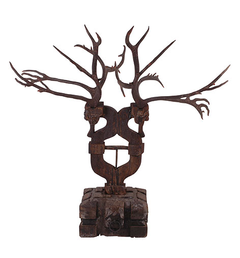 The tomb guards a two-headed face in opposite directions and are carved in the shape of a dragon’s head with large eyes and long tongues extending to the neck where the two heads join together. Each head has a pair of giant antlers which twist and tangle intricately and add an air of mystery and vividness to the whole image. The tomb guard is painted black and decorated with colorful patterns in various shapes such as clouds and a rhombus. This piece has the most spectacular and grotesque design among all the Chu tomb guards.