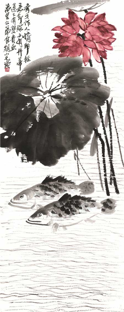At Wen Jin Ge's sales, his ink-and-color hanging scroll, Jia Ou Tian Cheng (An Ideal Couple) sold for 4.485 million yuan, nearly triple the pre-sale estimate. The painting was a wedding gift to Qi's student Zhang Wanli, showing twin lotus flowers on the same stalk emerging from water, beneath the surface of which are two fish. The image represents the ideal of happiness and harmony.