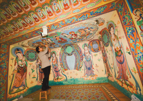 Some 320 square meters of murals, similar in size to those in the Mogao Grottoes, a UNESCO world heritage in Dunhuang, Northwest China's Gansu province, are almost complete.