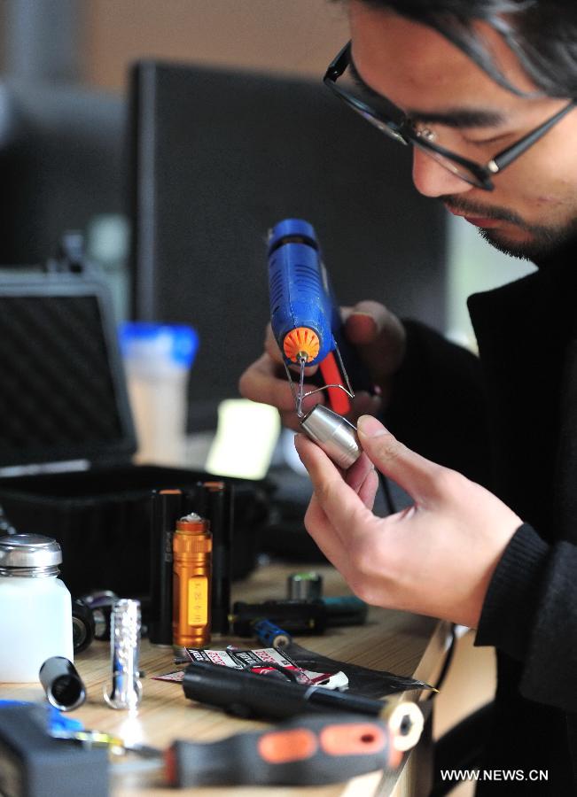 Liu Hongxin works on a light painting tool in his studio in Fuzhou, capital of southeast China's Fujian province, Jan. 21, 2014. [Xinhua/Lin Shanchuan]