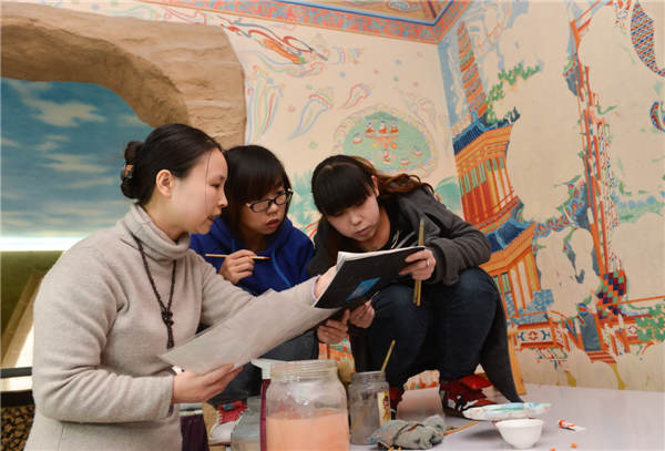 "Previously we painted the Dunhuang murals on canvas and paper, but this time we reproduced the entire mural on the wall. It would cost us a lot to fix if we made mistakes while painting on the wall," Yang says.