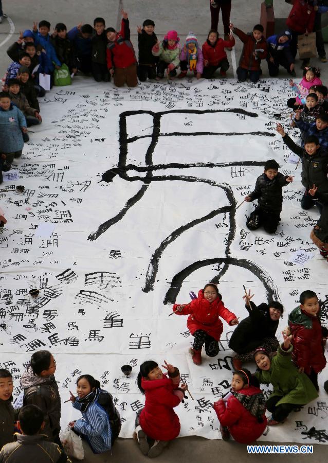 A giant calligraphy work of the Chinese character Ma, meaning horse, is made to greet the upcoming Chinese lunar new year, the Year of Horse, in Ma'anshan city of east China's Anhui province, Jan. 20, 2014. (Xinhua/Cheng Qianjun)