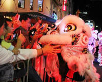 The dragon masks used during parades are commonly very complex and elaborate with vivid colors, usually in gold, red and blue with fur and feathers headed by the large dragon mask which usually features bright red. A traditional dragon mask will typically have either a wide rounded mouth or a yawning jaw. The person at the head of the dragon dance procession will wear the mask or hold it above his or her head as the dragon dances and snakes along through the streets.