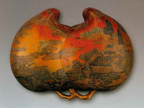 The box is shaped like two conjoined peaches and coated with red lacquer all over the body. The lid and the box are adorned with motifs of sea wave, cliffs and flowing clouds using various colors of lacquer, including red, yellow, black and green, etc. On the left of the landscape picture, there are divine mountains, towers and pavilions surrounded by pine trees. In front of the pavilions, there are railings, in which a bottle stands. The bottle holds the lots brought in by the several cranes in the distance. It's a picture depicting the idiom of "the sea house adds in lots", which symbolizes a longevity wish. The inside and bottom of the box is coated with black lacquer.