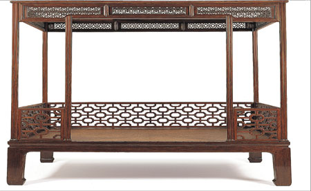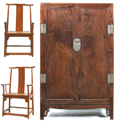 Perfection of Life displays some of the country's finest antique furniture, including a huanghuali canopy bed (top),a pair of huanghuali high yoke-back armchairs and a corner cabinet.