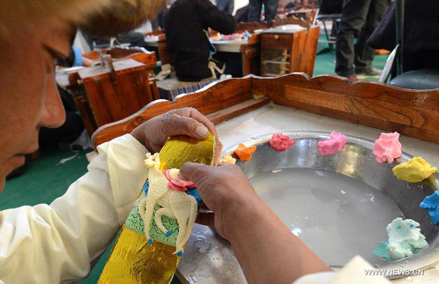 A craftsman makes a butter sculpture in Kangxung township of Rinbung county in Shigatse, Southwest China's Tibet autonomous region, March 27, 2014. There are about 100 butter sculpture craftsmen in Kangxung because of the growing need in market. Butter Sculpture is an ancient and unique genre of art in Tibet which was listed as a national intangible cultural heritage by the State Council in 2006.[Photo/Xinhua]
