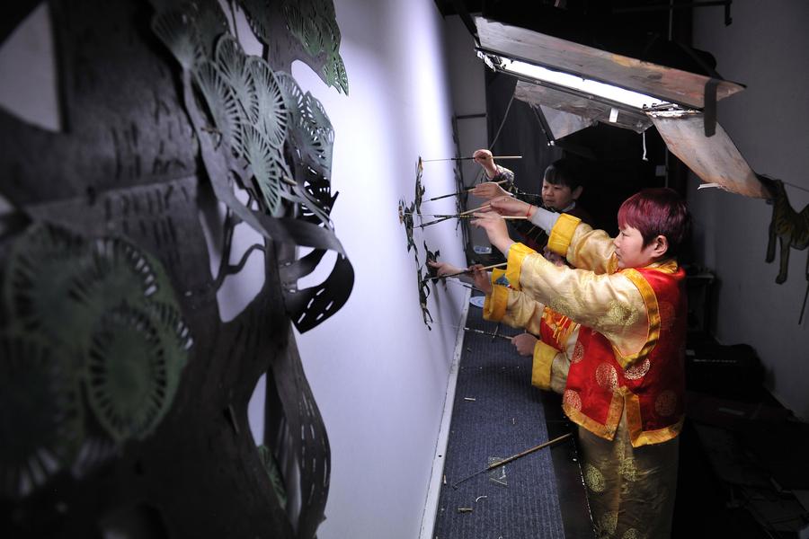 An actor from the shadow puppet troupe composed of "pocket people" rehearses a shadow play in the ancient town of Pingyao, Shanxi province, April 14. [Photo/Xinhua]