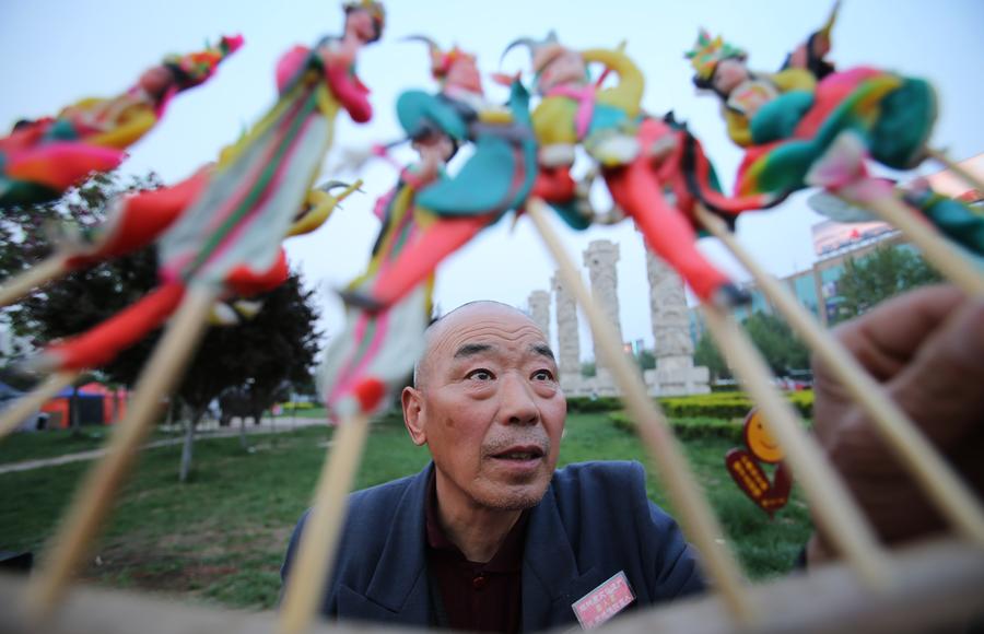 Dong Jinlong sells his dough figurines on the street, April 21, 2014. [Photo/Xinhua]