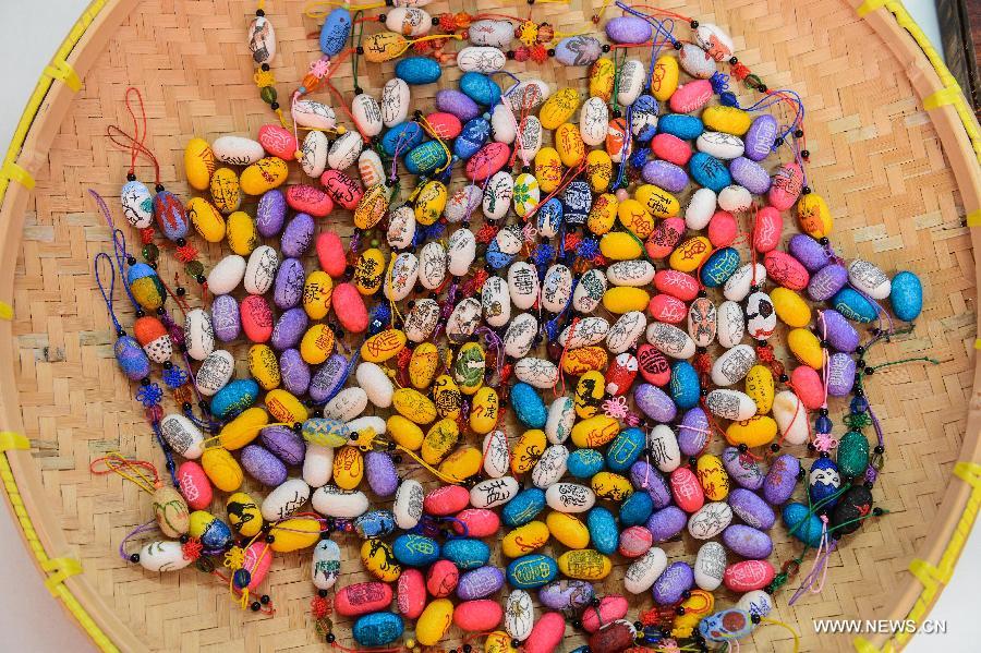 Finished paintings on silkworm cocoons are seen at Chen Jianqing's workshop, in Tongxiang, east China's Zhejiang Province, May 8, 2014. Chen Jianqing, an art teacher with Fengming High School in Tongxiang, began to create unique paintings on silkworm cocoons several years ago. After trying hundreds of times, Chen has worked out techniques of cocoons antiseptic and multi-colors sustainability. (Xinhua/Xu Yu)