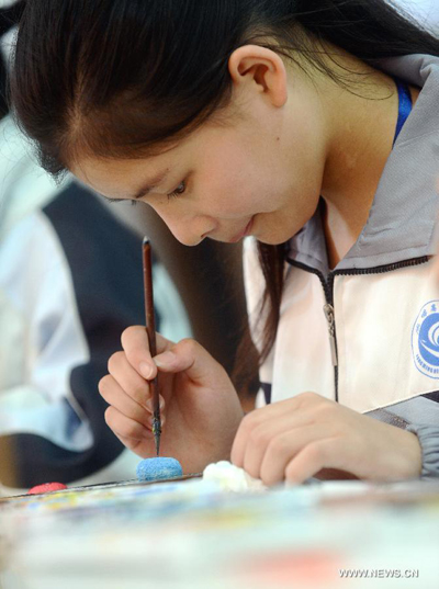 A student of Chen Jianqing learns to make paintings on silkworm cocoons in Tongxiang, east China's Zhejiang Province, May 8, 2014. Chen Jianqing, an art teacher with Fengming High School in Tongxiang, began to create unique paintings on silkworm cocoons several years ago. After trying hundreds of times, Chen has worked out techniques of cocoons antiseptic and multi-colors sustainability. (Xinhua/Xu Yu)