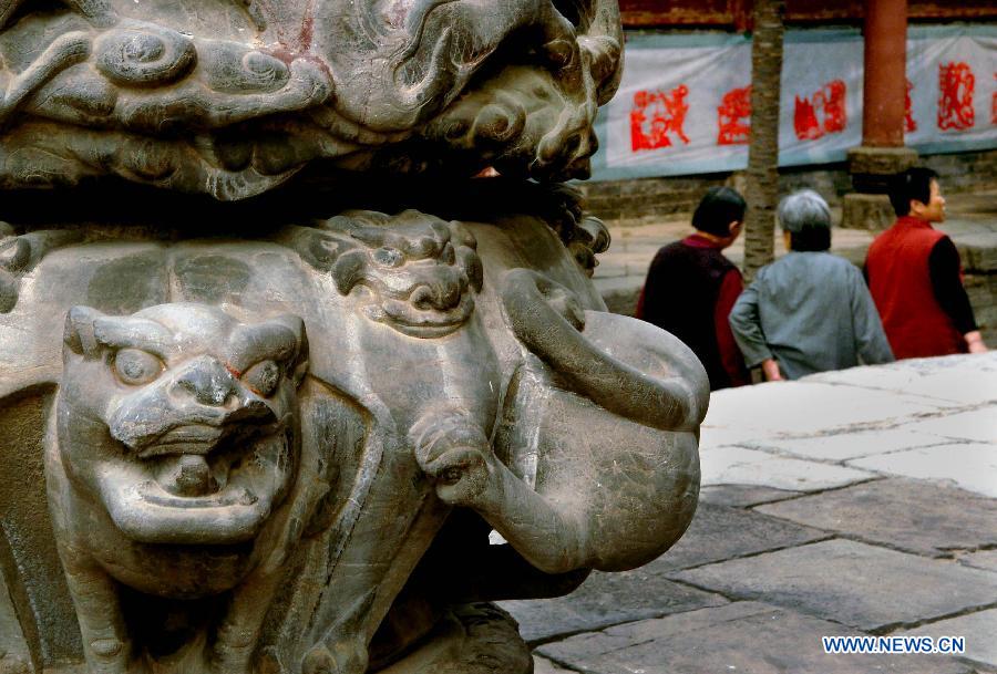 Photo taken on April 11, 2012 shows a sculpted stone column base at the Luoyang Folklore Museum in Luoyang, central China's Henan Province. A large number of architectural sculptures have been preserved in historical sites of Henan, which is one of the cradles of the Chinese civilization. Many of the sculptures, created from stones, bricks, or wood, were used as building parts of residences, shrines and memorial archways, among other architecture types. Underlining both the mood and the details, these sculptures have themes including daily life, legends, myths and opera scenes. (Xinhua/Wang Song)