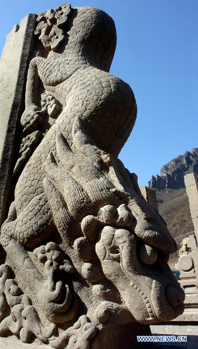 Photo taken on March 23, 2012 shows a stone fender pillar with dragon sculpture at the Taiping Temple in Qinyang, central China's Henan Province. A large number of architectural sculptures have been preserved in historical sites of Henan, which is one of the cradles of the Chinese civilization. Many of the sculptures, created from stones, bricks, or wood, were used as buiding parts of residences, shrines and memorial archways, among other architecture types. Underlining both the mood and the details, these sculptures have themes including daily life, legends, myths and opera scenes. (Xinhua/Wang Song)