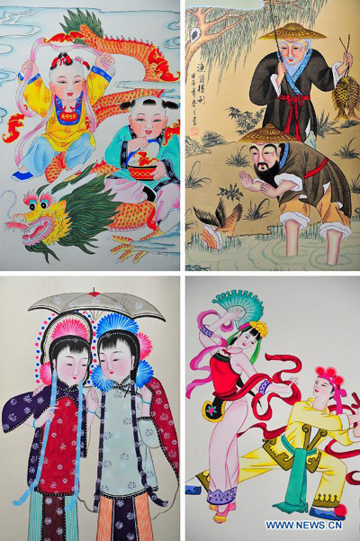 Combined photo taken on June 1, 2014 shows Gaomi ash-patting new year paintings, in Gaomi, east China's Shandong Province. Gaomi ash-patting new year painting is a traditional art craft which has enjoyed a history of over 500 years and only existed in Gaomi. It has been included in the list of national intangible cultural heritages. (Xinhua/Guo Xulei)