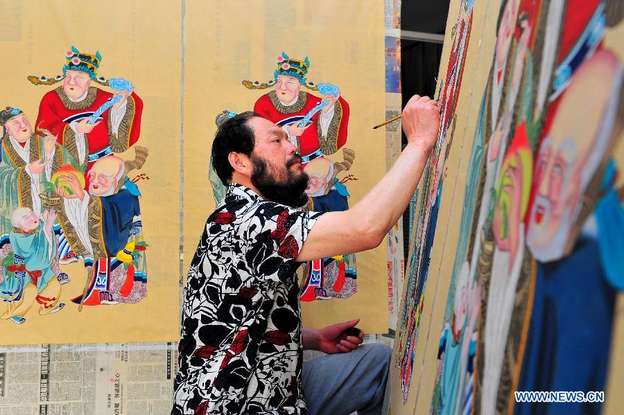 Shi Jianting, the sixth generation successor of Gaomi ash-patting new year painting, works on a painting at a studio in Gaomi, east China's Shandong Province, June 1, 2014. Gaomi ash-patting new year painting is a traditional art craft which has enjoyed a history of over 500 years and only existed in Gaomi. It has been included in the list of national intangible cultural heritages. (Xinhua/Guo Xulei)