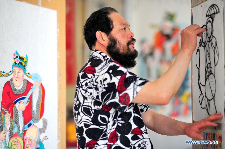 Shi Jianting, the sixth generation successor of Gaomi ash-patting new year painting, draws a sketch at a studio in Gaomi, east China's Shandong Province, June 1, 2014. Gaomi ash-patting new year painting is a traditional art craft which has enjoyed a history of over 500 years and only existed in Gaomi. It has been included in the list of national intangible cultural heritages. (Xinhua/Guo Xulei)