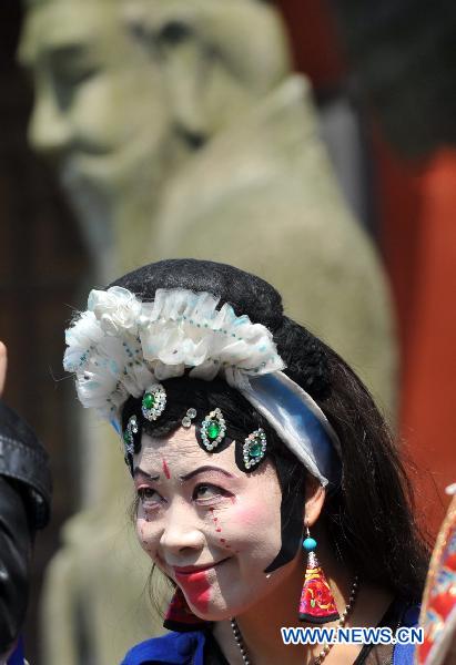 An actress of a local troupe practises before the Mulian Opera performance in Xinchang county, east China's Zhejiang province, March 14, 2011. It was the first Mulian Opera performance in Xinchang since 1996. The Mulian Opera, is also called "Guixi", meaning "ghost opera" in Chinese, as most of players perform with ghost-like make-ups. As one of the oldest Chinese theatric genres, it refers to the tale about Mulian saving his mother, a major play performed in the opera. As time goes on, the Mulian Opera has become an integration of folk stories, sideshows and acrobatics. However, the opera has been dying since 1980s as fewer people were interested in it. It has been listed as one of the national intangible cultural heritages in 2006 and become revival in recent years as more people found its cultural values. [Xinhua/Wang Dingchang]