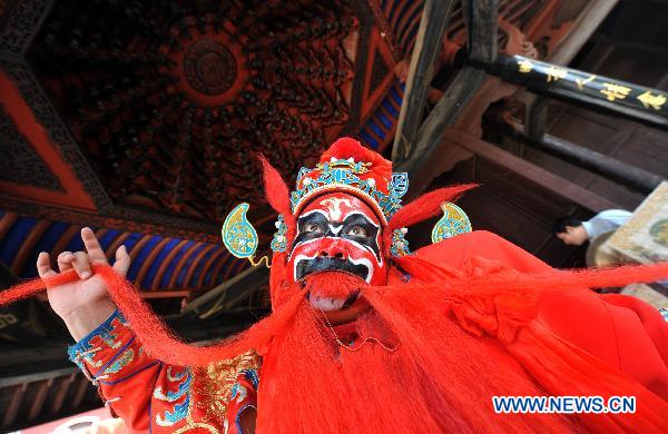 An actor performs the Mulian Opera in Xinchang county, east China's Zhejiang province, March 14, 2011. It was the first Mulian Opera performance in Xinchang since 1996. The Mulian Opera, is also called "Guixi", meaning "ghost opera" in Chinese, as most of players perform with ghost-like make-ups. As one of the oldest Chinese theatric genres, it refers to the tale about Mulian saving his mother, a major play performed in the opera. As time goes on, the Mulian Opera has become an integration of folk stories, sideshows and acrobatics. However, the opera has been dying since 1980s as fewer people were interested in it. It has been listed as one of the national intangible cultural heritages in 2006 and become revival in recent years as more people found its cultural values. [Xinhua/Wang Dingchang]