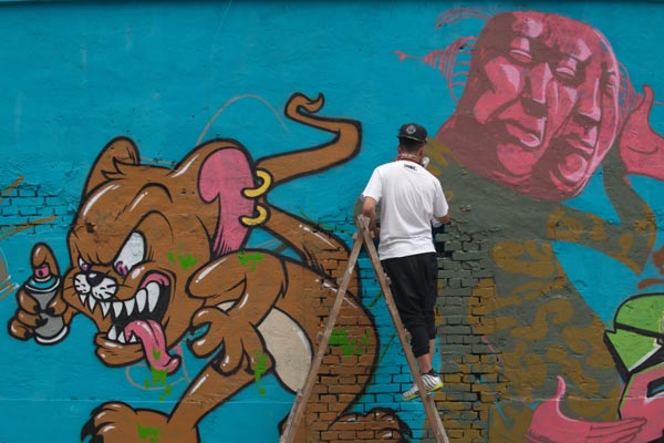 A graffiti artist works on an unfinished project on the wall of a back alley in Beijing. Wei Xiaohao / China Daily