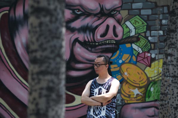 Graffiti artist Ye Shu stands in front of a large graffiti ineast Beijing at Jing Mi Lu. Wei Xiaohao / China Daily