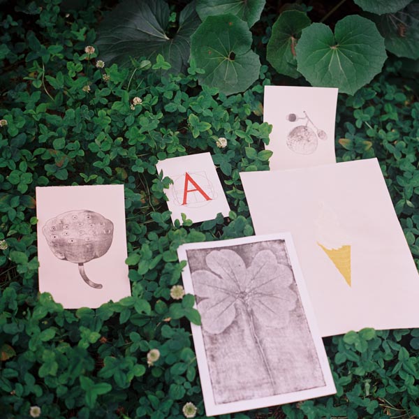 Meng collects items from nature such as fig leaves and flower stems. He separates them according to specimen, and makes copper plate intaglio prints of the plants' patterns.