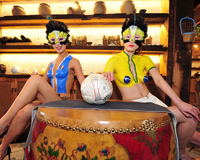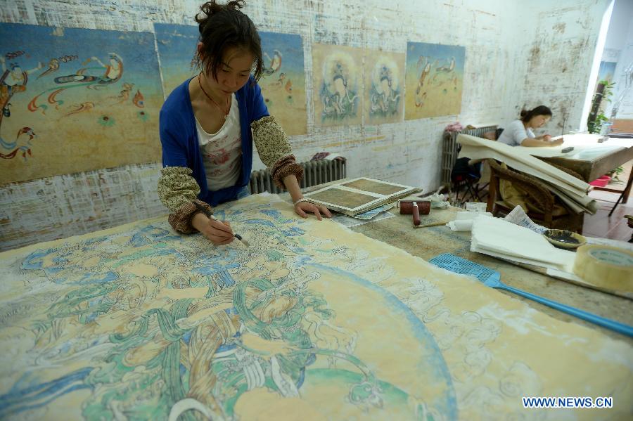 A painter draws a mural painting at a studio in Yuequan Town, Dunhuang City, northwest China's Gansu Province, June 27, 2014. Attracted by the art form of Mogaoku Grottos mural, more and more young artists gathered in Dunhuang to learn for mural creation and set up their studios. [Xinhua/Nie Jianjiang]